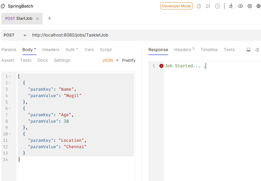 2025-09-15T18:20:12.052+05:30  INFO 25776 --- [FileChecker] [         task-1] o.s.b.c.l.s.TaskExecutorJobLauncher      : Job: [SimpleJob: [name=job]] launched with the following parameters: [{'time':'{value=1757940612019, type=class java.lang.Long, identifying=true}','Age':'{value=38, type=class java.lang.String, identifying=true}','Name':'{value=Mugil, type=class java.lang.String, identifying=true}','Location':'{value=Chennai, type=class java.lang.String, identifying=true}'}]