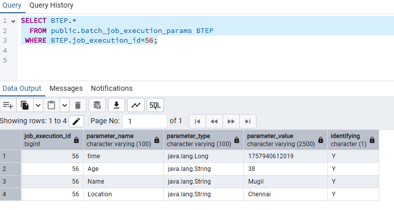 2025-09-15T18:20:12.071+05:30  INFO 25776 --- [FileChecker] [         task-1] o.s.b.c.l.s.TaskExecutorJobLauncher      : Job: [SimpleJob: [name=job]] completed with the following parameters: [{'time':'{value=1757940612019, type=class java.lang.Long, identifying=true}','Age':'{value=38, type=class java.lang.String, identifying=true}','Name':'{value=Mugil, type=class java.lang.String, identifying=true}','Location':'{value=Chennai, type=class java.lang.String, identifying=true}'}] and the following status: [COMPLETED] in 13ms